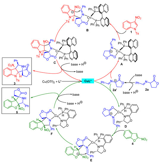 Based on our experimental results and previous related reports [27,28,29,30,31,37,38,39,40], a plausible catalytic mechanism involving a stepwise reaction process was assumed to explain the stereoselectivity of the asymmetric dearomative [3+2] cycloaddition of α-imino γ-lactones with electron-deficient nitroheteroarenes (Scheme 5). For the reaction with 3-nitroindoles as partners, the in situ-formed azomethine ylide 2a’ is coordinated to the chiral CuL* complex, leading to the active species A. Under the chiral environmental control, the α-carbon anion of 2a’ approaches the Re face of the C2-position of 3-nitroindoles 1, resulting in the intermediate B. Subsequently, the C3-positon carbon anion of 1 attacks the Si face of the C=N of azomethine ylide to deliver the species C, which is protonated, giving rise to the formation of products 3 with the specific stereochemical outcome and regenerating the chiral catalyst for the next cycle. Likewise, for the reaction with 2-nitrobenzofurans as partners, the active species D is formed from the azomethine ylide 2a’ and the chiral CuL* complex. The α-carbon anion of 2a’ attacks the Si face of the C3-position of 2-nitrobenzofurans to form intermediate E, which undergoes an intramolecular cyclization from the C2-positon carbon anion of 4 to the Si face of the C=N of azomethine ylide to generate species F. Then, a protonation of F leads to the formation of products 5 and the release of a chiral catalyst.