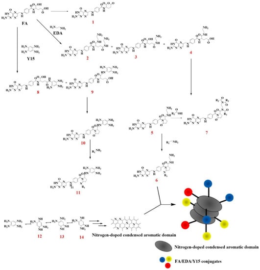 - Qu, D.; Zheng, M.; Zhang, L.; Zhao, H.; Xie, Z.; Jing, X.; Haddad, R.E.; Fan, H.; Sun, Z. Formation mechanism and optimization of highly luminescent N-doped graphene quantum dots. Sci. Rep. 2014, 4, 5294. [Google Scholar] [CrossRef] [PubMed]