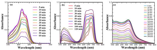 The investigation of the adsorption behaviour on the surface of the mesoporous TiO2 not only helps to obtain information about the optimum dye adsorption for better photon harvesting but also provides valuable information about their aggregation, which must be controlled for the optimal DSSC performance. Taking this into consideration, the adsorption behaviour of the sensitizing dyes under investigation was studied by monitoring the spectral absorption changes in the dyes on the mesoporous TiO2 as a function of time, which is shown in Figure 2a perusal of the dye adsorption behaviour of NK-3705 revealed that a monomeric dye absorption peak appearing at 430 nm became suppressed with the enhancement of the additional blue-shifted peak appearing at 415 nm as a function of time. This was attributed to the blue-shifted H-aggregate formation on the TiO2 surface. At the same time, squaraine dye SQ-140 also exhibited a similar trend of enhanced H-aggregate formation as a function of the increasing dye adsorption time; the blue-shifted vibronic shoulder appearing at 630 nm became more pronounced, and this aggregate peak became almost similar to that of the monomeric dye absorption peak after 60 min of dye adsorption. The planer π-conjugated molecular framework of NK-3705 and SQ-140 could be responsible for the H-aggregate formation, which is very commonly observed in cyanine and squaraine dyes. This is why bulky chenodeoxycholic acid (CDCA) has most commonly been used to prevent dye aggregation and to improve the photovoltaic performance of the DSSCs [28,29]. Contrary to this, Z-907 showed a monotonous increase in the absorbance as a function of dye adsorption time on the mesoporous TiO2 surface. There was no shift in the λmax at 520 nm, indicating that there was no dye aggregation, unlike with NK-3705 and SQ-140. This is attributed to the non-planer 3D molecular structure of Z-907 with two long alkyl chains substituted in the phenyl ring, restricting the dye aggregation. This is further supported by the fact that there is no need to add CDCA along with the dye to prevent dye aggregation and enhance PCE-like squaraine dyes.
