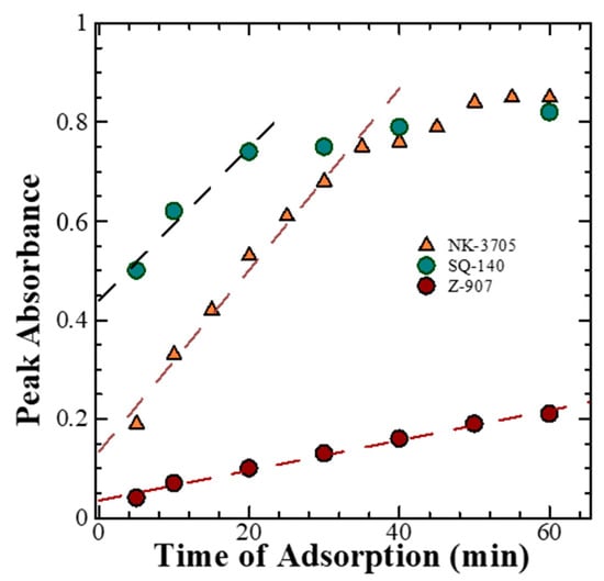 The time-dependent absorption spectral changes for dye adsorption as a function of time for different dyes, as shown in Figure 2, reveal that there is a differential rate of the dye adsorption on the mesoporous TiO2, as shown in Figure 3. It is evident from this figure that there is a saturation in the peak absorbance at about 30 min for the NK-3075 and SQ-140 dyes, with the rate of dye adsorption estimated to be 0.018 abs./min and 0.015 abs./min, respectively. On the other hand, Z-907 depicts a very slow dye adsorption, taking more than 5 h to reach saturation for the same thickness of the mesoporous TiO2 layer. An estimated dye adsorption rate of 0.003 abs./min demonstrates that Z-907 exhibits dye adsorption at a rate >15 times slower than that of the other two dyes, NK-3075 and SQ-140, as used in the present investigation.