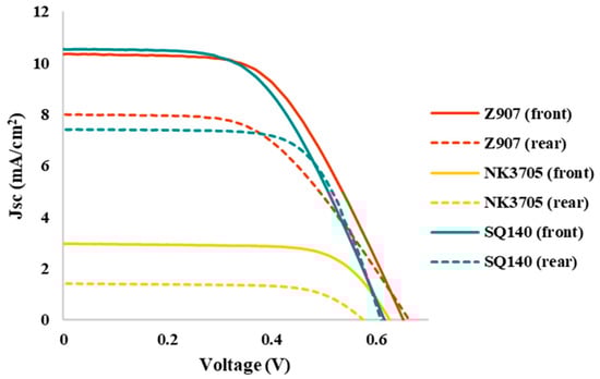 Figure 4 depicts the photovoltaic characteristics of the DSSCs using different sensitizing dyes; the summarization of the photovoltaic parameters in terms of short-circuit current density (Jsc), open circuit voltage (Voc), fill factor (%), and photoconversion efficiency (PCE) is shown in Table 2. It can be seen from Figure 4 and Table 2 that amongst the different sensitizers used, the BF-DSSCs fabricated using NK-3705 exhibited not only the least cumulated PCE but also the smallest BFF. The cause of the lowest PCE is a tiny optical absorption window of about 100 nm (350–450 nm), as shown in Figure 1, leading to a very small Jsc. On the other hand, the highly hampered PCE under rear illumination is attributed to the filtering effect by iodine-based redox electrolyte since the triiodide ion of the electrolyte has been reported to absorb the light in a similar optical absorption window [30]. Therefore, the part of the incoming photons incident under rear illumination gets absorbed by the electrolyte, resulting in highly hampered PCE. On the other hand, owing to the relatively higher optical absorption window, mainly invisible for Z-907 (350–700 nm) and dominant in NIR for SQ-140 (380–760 nm), as shown in Figure 1, it could be attributed to the nearly similar cumulated PCE of about 6.5% for the BF-DSSCs fabricated using these two sensitizing dyes. It is worth mentioning here that the BFF for the BF-DSSCs fabricated using SQ-140 was found to be higher (86%) than the BF-DSSCs based on Z-907 (75%). This can also be explained by considering the electrolyte’s enhanced optical filtering effect in the case of Z-907 compared to that of SQ-140.