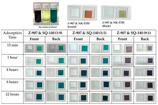 On the other hand, it can be seen from Figure 1 that Z-907 and SQ-140 dyes exhibit complementary optical absorption, mainly absorbing light in the visible and NIR wavelength region, respectively. This advantage takes into consideration the detailed investigation of their adsorption behaviours on mesoporous TiO2; the investigation was conducted by taking their different ratios and subjecting them to dye adsorption for different time intervals, as summarized in Figure 5. It can be seen from this figure that by controlling the ratio of Z-907 and SQ-140 and dye adsorption time, it is possible to control the dye adsorption that forms a mixed layer and a dye bilayer. For example, in the case of the short time of dye adsorption for a period of 1 h, their 9:1 and 1:1 molar ratios depicted different colours to those of the front and back sides. At the same time, a similar observation was made for a longer time of dye adsorption (>4 h) when they were taken utilizing these two dye systems at a 1:9 ratio to fabricate BF-DSSCs. This could be attributed to the fact that in the case of a single dye, SQ-140 exhibits a rate of dye adsorption about three times higher and a binding about four times weaker on mesoporous TiO2 as compared to Z-907, as is shown and discussed in Figure 3 and Table 1, respectively.