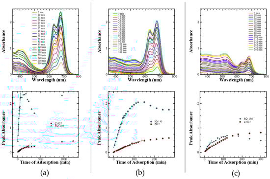 Change in the absorption spectra (top) and peak absorbance corresponding to Z-907 and SQ-140 as a function of time (bottom) for the dye adsorption on mesoporous TiO2 from the dye cocktails of two sensitizing dyes taken in different molar ratios (a) 1:9, (b) 1:1, and (c) 9:1.