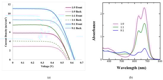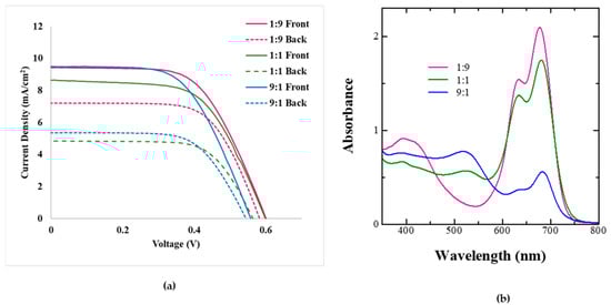 As discussed in the previous section, it is possible to attain bilayer dye adsorption from dye cocktails by controlling their ratios and dye adsorption times owing to the differential rate of dye adsorption and binding strength on the mesoporous TiO2. Taking this into consideration, BF-DSSCs were fabricated using dye cocktails of Z-907 and SQ-140 in different molar ratios and utilizing the corresponding photoanodes for a short period (1 h) of dye adsorption. The photovoltaic characteristics of BF-DSSCs after the front and back light illuminations are shown in Figure 7a, followed by the photovoltaic parameters in Table 3.