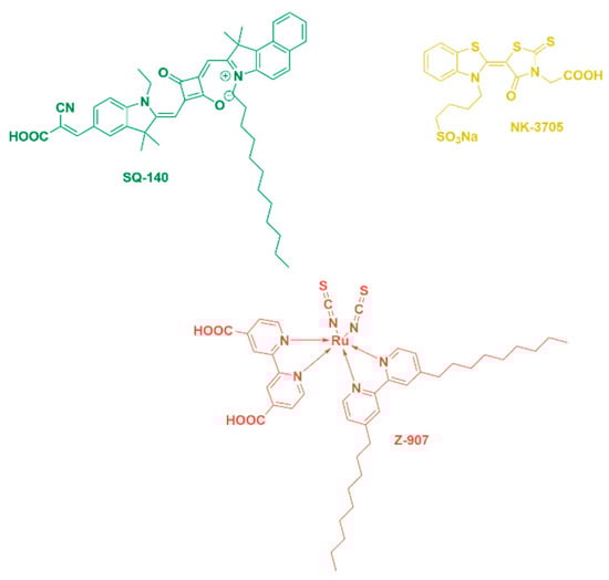 A green-coloured unsymmetrical squaraine dye, SQ-140, was synthesized and characterized as per our earlier publications and employed as an NIR sensitizer in this study for constructing bifacial DSSCs [31]. The Ruthenizer 520-DN red-dye Z-907 is a hydrophobic dye that very efficiently sensitizes semiconductors with a wide-bandgap oxide up to the 700 nm wavelength region. The NK-3705 yellow dye is a dye that harvests light in the lower wavelength up to 450 nm. The molecular structures of the sensitizing dyes are shown in Figure 9.