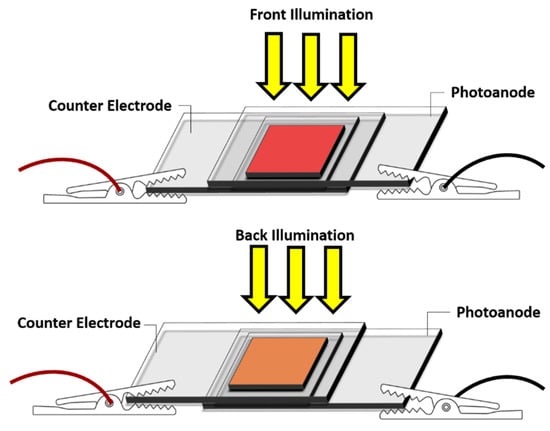 The photovoltaic performance of the fabricated bifacial BF-DSSCs was evaluated using a solar simulator (CEP-2000 Bunko Keiki Co., Ltd., Osaka, Japan) fitted with a xenon lamp (Bunko Keiki BSO-X150LC, Osaka, Japan) employed as a source of simulated solar irradiation at 100 mW/cm2, AM 1.5 G. After illuminating the DSSCs with identically intense light from the front and back, the photovoltaic performances were measured simultaneously. The device area of 0.25 cm2 was fixed during the measurement using a black metal mask. Figure 10 depicts the schematic representation of the BF-DSSC, where the simulated 1 Sun illumination was irradiated from the front and the rear sides. The bifaciality factor (BFF) of the output of the rear side PCE over the frontal PCE was calculated and presented as a percentage.