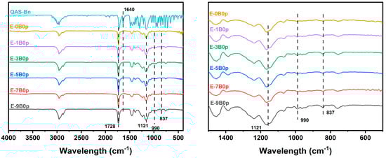 Cationic acrylate emulsions with different contents of QAS-BN were prepared. The FTIR spectra of the cationic acrylate emulsions and monomer QAS-BN are presented in Figure 1. Within them, the 1640 cm−1 position is the stretching peak of the methacrylic acid double bond, which disappeared from the FTIR spectrum of the polymer emulsion sample, indicating that the monomer had completed the copolymerization reaction and there was no unreacted monomer in the emulsion samples. The 1728 cm−1 position is the stretching vibration peak of the carbonyl group, indicating the successful copolymerization of BA and MMA to the copolymer molecular chain. The 990 cm−1 position is the characteristic peak of the quaternary ammonium group, meaning that QAS-BN had been successfully polymerized into the copolymer molecular chain. The broad peak at 1121 cm−1 is the antisymmetric stretching vibration peak of Si-O-Si. The characteristic absorption peak of Si-C at 837 cm−1 indicated that the silicone had been successfully copolymerized to the polymer chains. The above characteristic peaks were reflected in the IR patterns of these emulsion samples with different QAS-BN dosages, indicating that the copolymerization of the reactive monomers BA, MMA, VTES, and QAS-BN was completed for all the emulsion samples.