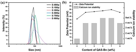 (a) Particle size of emulsions with different QAS-BN dosages; (b) zeta potential and calcium ion stability of emulsions with different QAS-BN dosages.