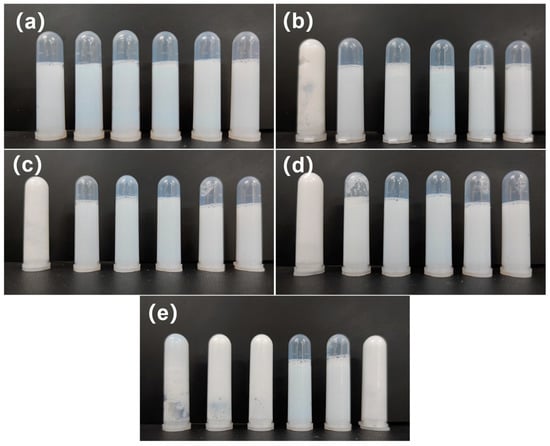 Calcium ion stability test results: (a–e) the mass fractions of calcium chloride solution used were 1 wt.%~5 wt.%, and the test samples are E-0B0p, E-1B0p, E-3B0p, E-5B0p, E-7B0p, and E-9B0p from left to right.