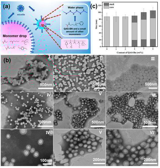 (a) Schematic diagram of the formation process of CACS emulsion particles; (b) TEM of latex with different QAS-BN dosages (I—E-0B0p; II;—E-1B0p; III—E-3B0p; IV/IV’—E-5B0p; V/V’—E-7B0p; VI/VI’—E-9B0p); (c) average size of latex particles calculated from TEM images.
