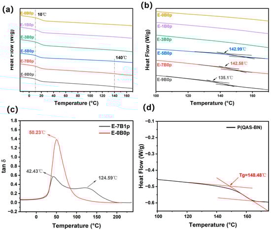 (a,b) DSC of latex films with different QAS-BN dosages. (c) DMA of latex films with different QAS-BN dosages. (d) DSC of QAS-BN homopolymer.