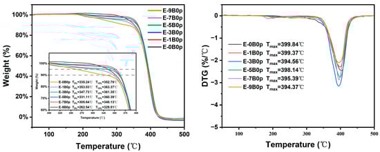 The TGA results are shown in Figure 6 and Table 3. The T5% (5% mass loss) was used to represent the onset temperature of degradation, and the T10% (10% mass loss) was used to evaluate the thermal stability of the latex films. The T5% of samples E-0B0p, E-1B0p, E-3B0p, E-5B0p, E-7B0p, and E-9B0p was 335.24 °C, 353.03 °C, 347.73 °C, 331.11 °C, 305.64 °C, and 262.54 °C, respectively; the T10% was 352.78 °C, 363.37 °C, 361.35 °C, 360.39 °C, 348.13 °C, and 329.51 °C, respectively. Except for sample E-0B0p, the T5% and T10% values of the samples gradually decreased with the increase in QAS-BN dosage. This indicated that the thermal stability of the latex films gradually decreased with the increase in QAS-BN dosage. This was caused by the decomposition of the quaternary ammonium group due to the lower bonding strength of the C-N bond than the C-C bond. However, the T5% and T10% values of sample E-0B0p were lower than those with 1 wt.% and 3 wt.% QAS-BN added. The observation of the curves revealed that the weight loss of E-0B0p was low until the temperature was increased to 250 °C. This indicated that introducing QAS lowered the latex film’s initial decomposition temperature but improved the polymer’s thermal stability [].