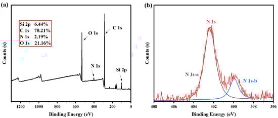 (a) XPS spectral results of sample E-7B0p; (b) N-element peaks in XPS spectral results of sample E-7B0p.