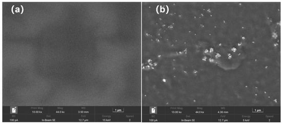 The surface morphology of the latex films observed by SEM are shown in Figure 8. The surface of the latex film of the E-1B0p sample had a uniform structure and smooth surface. The surface of the latex film of the E-7B0p sample featured protruding particles, which were fused latex particles without complete melting. This was because the latex particles of the E-0B0 sample were soft-core and hard-shell latex particles. The latex film’s surface morphology also corroborated the latex particles’ morphological results.