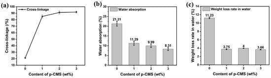 (a–c) Crosslinkage/water absorption/weight loss rate in the water of CACS emulsions with different p-CMS/EDA dosages.