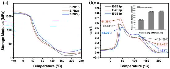 Figure 11 shows the DMA test results for samples with crosslinker additions from 1 wt.% to 3 wt.%. As a rule of thumb, the magnitude of the crosslinking density of a sample can be roughly estimated by the importance of the storage modulus in the platform region of the high-temperature region []. For example, Figure 11a shows that the storage modulus’s magnitude in the high-temperature zone’s platform region was E-7B3p > E-7B2p > E-7B1p. Therefore, the ranking of the magnitude of the crosslink density for these samples could be estimated as E-7B3p > E-7B2p > E-7B1p. In addition, according to the derivation equation of rubber elasticity theory, the following relationship exists between the crosslink density (VE) and the storage modulus (E) in the platform region of the rubber [].