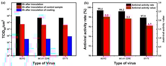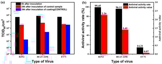 (a) Changes in the number of viruses after antiviral testing of the coating (control); (b) Anti-viral activity value and anti-viral activity rate of the coating (control).