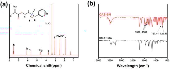 (a) 1H NMR spectrum of monomer QAS-BN; (b) FTIR spectra of monomer QAS-BN and reaction material DMAEMA.