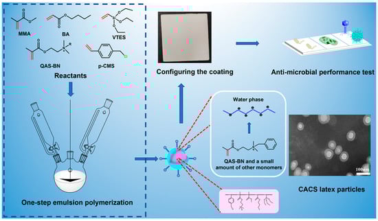 2-(Dimethylamine) ethyl methacrylate (DMAEMA), benzyl bromide, methyl methacrylate (MMA), butyl acrylate (BA), 2,2’-azobis(2-methylpropionamidine) dihydrochloride (AIBA), hexadecyl trimethyl ammonium bromide (CTAB), and hexyl hydride were all supplied by Macklin Reagent Co., Ltd. (Shanghai, China). Triethoxyvinylsilane (VTES) was purchased from Jinan Uno Chemical Co., Ltd. (Jinan, China). P-chloromethyl styrene (p-CMS) was purchased from Guangzhou Yuanda New Material Co., Ltd. (Guangzhou, China). All the above materials were analytical reagents used directly without treatment after purchase. The emulsifier, dispersant, defoamer, antifreeze, titanium dioxide, dicalcium, water-washed kaolin, calcined kaolin, film-forming additives, leveling agent, and thickening agent used in the coating preparation were all industrial-grade raw materials purchased from the market. All experimental water was deionized water.