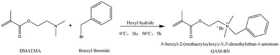 The antimicrobial functional monomer was obtained by the Hoffman alkylation reaction [,,] of benzyl bromide with DMAEMA. The reaction equation is provided in Scheme 1 (further synthesis mechanisms can be found in Scheme S1 from Supplementary Materials). Specifically, benzyl bromide and DMAEMA were mixed in hexyl hydride in a 1:1 ratio and stirred to react fully, and the solid pre-product was obtained by filtration. Next, the product was washed using hexane and acetone and dried under a vacuum to obtain a solid white product. The 1H NMR and FTIR spectra of the monomer are presented in Figure 14.