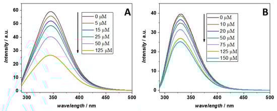 Fluorescence quenching is a widely used technique to gain information on the interaction of serum proteins with drugs or small ligands [66,67]. The fluorescence emission of proteins comes from the three aromatic residues tryptophan, tyrosine, and phenylalanine. Phenylalanine has a very low quantum yield, and the fluorescence of tyrosine is almost totally quenched if it is ionized or close to an amino group, a carboxyl group, or a tryptophan. Hence, the fluorescence of proteins (and thus also of HSA and hTf) is almost exclusively due to the tryptophan emission alone. Particularly, the emission spectrum of HSA mainly derives from a single tryptophan residue located at the 214 position in the subdomain IIA, while that of hTf is essentially due to 8 Trp residues. In addition to the common sources of quenching, in the case of hTf, the two iron ions strongly affect the hTf emission spectrum [68]. Changes in the intrinsic fluorescence intensity of HSA and hTf proteins—due to spatial reorganization of the tryptophan residues—are evidenced when small molecules are bound to the proteins [69].