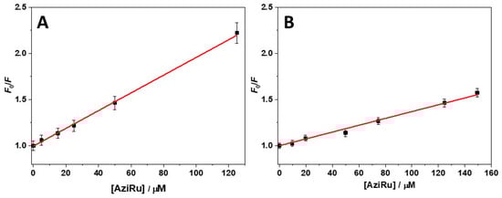Stern–Volmer plots for the binding of AziRu with (A) HSA and (B) hTf at 20 °C. The red lines represent the best fit of experimental data according to equation 1 reported in the text.