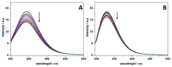 Fluorescence emission spectra of (A) HSA and (B) hTf in the absence (black spectra) and in the presence of increasing DoHuRu/DOTAP vesicles concentrations (colored spectra). The arrows indicate the direction of the effects due to increasing concentrations of DoHuRu/DOTAP. The excitation wavelength was set at 280 nm. All the experiments were performed in a 1-cm path length quartz cuvette at the temperature of 20 °C.