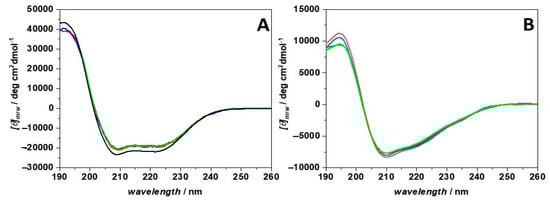 The same experiments were also performed in the presence of the DoHuRu/DOTAP liposomes, to verify possible conformational changes of the proteins imposed by the complexation with Ru(III) containing vesicles. In Figure 5, the CD spectra of HSA (panel A) and hTf (panel B) in the absence and presence of increasing concentrations of DoHuRu/DOTAP are shown.