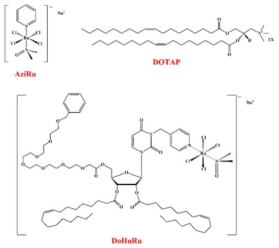 AziRu was prepared by reacting pyridine with Na+ [trans-RuCl4(DMSO)2]− in anhydrous acetonitrile, following a previously described protocol [34,38]. The nucleolipidic ruthenium complex, named DoHuRu, was prepared by reacting in stoichiometric amounts the starting nucleolipid, named DoHu [48], with the Ru complex Na+ [trans-RuCl4(DMSO)2]− following previously reported procedures [35,51,52].