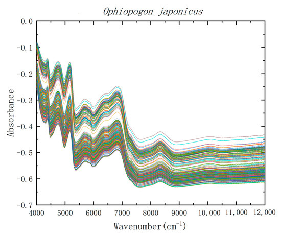 The NIR spectra of Ophiopogon japonicus were collected by a Bruker Tensor 37 spectrometer in diffuse reflection mode. The samples were illuminated using a fiber optic bundle and scattered light was collected. The wave number of the original NIR spectrum ranged from 12,000 to 4000 cm−1. In the test conditions, the resolution and scanning times were 8 cm−1 and 64 cm−1, respectively.