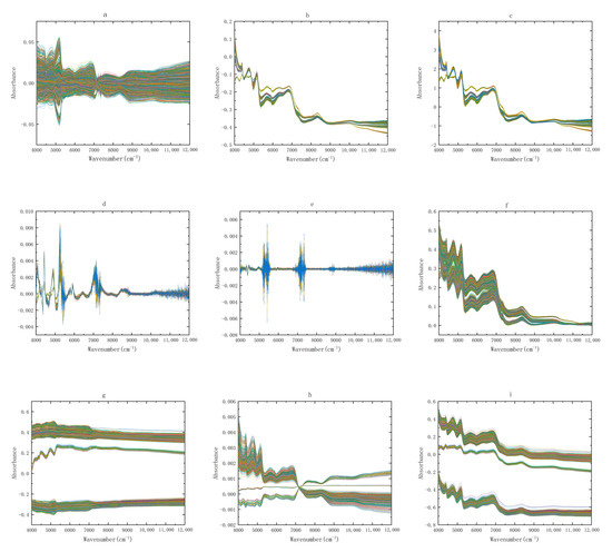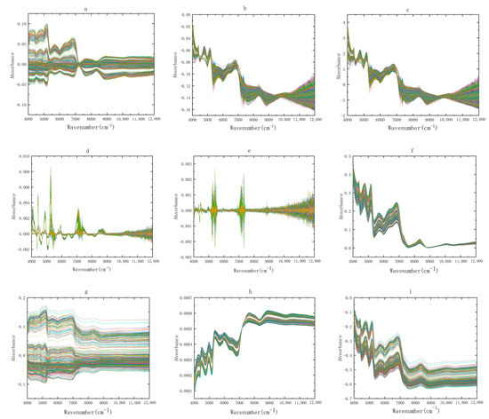 NIR spectra of non-Zhejiang Ophiopogon japonicus by nine preprocessing methods, (a) OSC, (b) MSC, (c) SNV, (d) first derivative, (e) second derivative, (f) baseline correction, (g) mean centering, (h) area normalization, and (i) Savitzky-Golay smoothing. Each color represents a sample of Ophiopogon japonicus.