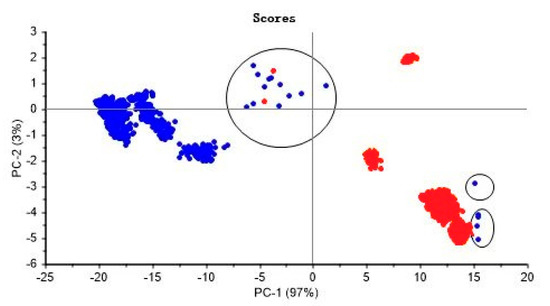 In this paper, PCA was chosen for outlier detection, and outliers were assessed by analyzing the high leverage (Hotelling T2 statistic) and residuals in the spectral data. In both cases, high-value samples with a significant level of 5% were considered as outliers [51,52]. The PCA results of Zhejiang and non-Zhejiang Ophiopogon japonicus are shown in Figure 4, with a total of 18 outlier samples, no. 26, 70, 189, 333, 545, 787, 789, 1453, 1672, 1834, 1990, 2366, 2370, 2678, 2881, 3021, 3451 and 3510, respectively.