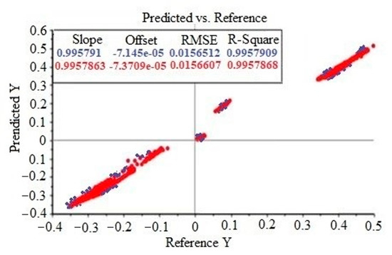 The evaluation of the PLSR system depends on the following two important indicators: the coefficient of determination (R2) and the root mean square error (RMSE). The closer R2 is to 1, the better the prediction performance of the model is. R2 is greater than 0.91, indicating that the model meets the requirements. RMSE is used to calibrate, cross-validate, and predict during the analysis and evaluation of regression fit. The lower the RMSE value, the better the model prediction effect [53]. All the data of Ophiopogon japonicus were divided into the training and test sets according to a 3:7 ratio using Monte Carlo cross validation (MCCV). Figure 5 shows the results of the test set for the PLSR of Ophiopogon japonicus. Y is the dependent variable in PLSR analysis, representing the absorption obtained after near-infrared spectrum detection. The R2 and RMSE of the raw NIR spectra of Ophiopogon japonicus reached 0.995791 and 0.015651, respectively, indicating that the origin model of Ophiopogon japonicus was ideal and the prediction accuracy was high. It can be seen from Figure 5 that the actual values (blue data) and validation values (red data) of the R2 and RMSE are almost the same, which also explains the stability of the PLSR model.