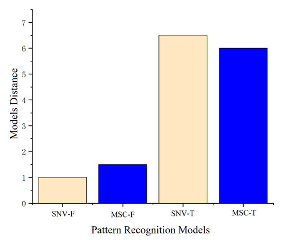 where r and g represent SIMCA models of samples within the origin and outside the origin, respectively. D(r, g) represents the distance between r and g, and k represents the variable. p is the number of data matrices. and represent the standard deviations of distance between the samples in the two models. represents the residual variance of the test sample [54]. Figure 8 shows the distance between the SIMCA models of Zhejiang and non-Zhejiang Ophiopogon japonicus, where SNV-T and SNV-F represent the distance between SIMCA models of Zhejiang and non-Zhejiang Ophiopogon, respectively, after SNV pretreatment. Similarly, MSC-T and MSC-F were the same. The distance between SIMCA-SNV-T and SIMCA-SNV-F was 5.5, while the distance between SIMCA-MSC-T and SIMCA-MSC-F was 4.5. The distances between both the two classification models of SIMCA-SNV and SIMCA-MSC were all greater than 3, indicating that the models have good performance and can be correctly classified.