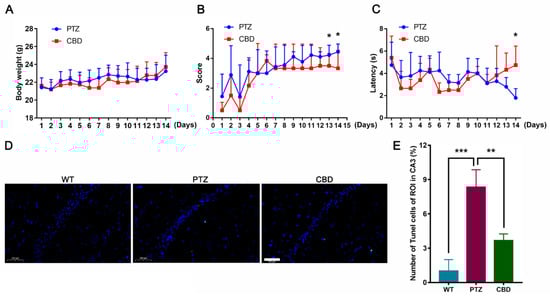 CBD attenuated the latency of PTZ-kindled mice. (A) The body weight of mice in the PTZ group and the CBD group, n = 10. (B) The seizure scores of mice in the PTZ group and the CBD group, n = 10. (C) The seizure latency of mice in the PTZ group and the CBD group, n = 10. (D) Representative TUNEL stained sections obtained from different groups of mice, n = 6. Scale bars = 100 µm. (E) Quantification of the TUNEL-positive number in hippocampus. * p < 0.05, ** p < 0.01, *** p < 0.001.