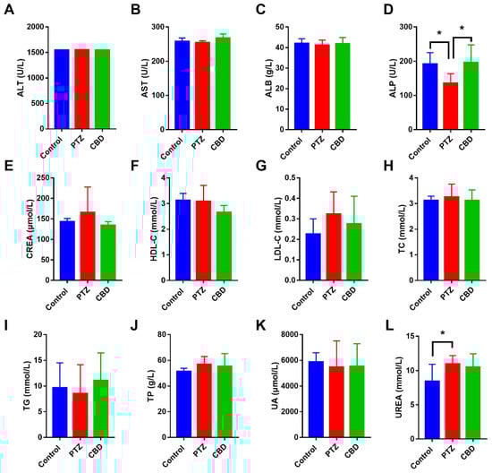 In order to understand the changes in blood biochemistry of the mice in the seizure, as well as to explore the safety of CBD in mice at an oral dose, we performed a fully automated blood biochemical analysis on the peripheral blood of the mice. We explored the levels of ALT, AST, ALB, ALP, CRA, HDL-C, LDL-C, TC, TG, TP, UA, and UREA in the peripheral blood. The results showed that the ALP level of mice in the PTZ group was decreased significantly (p = 0.02) compared with that of the control group, while the ALP level in the CBD exposure group were significant decreased (p = 0.01). In addition, the level of UREA in the PTZ group was increased significantly compared with that of the control group (Figure 2).