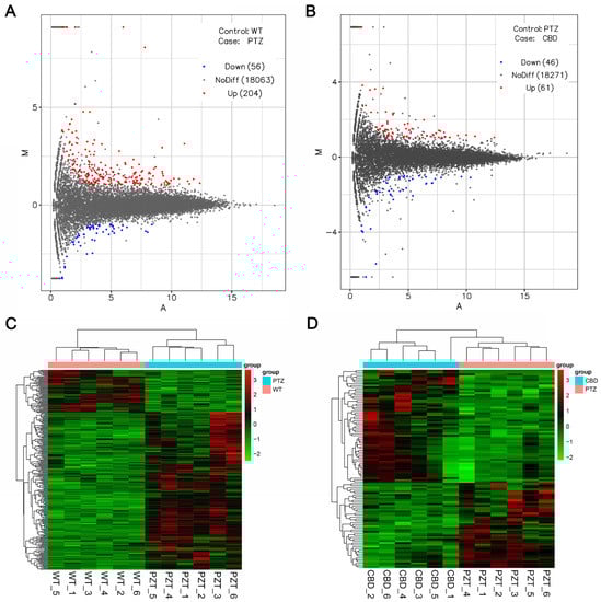 Gene expression profiling analysis of PTZ and CBD vs. PTZ. (A) The relationship between the different genes in each group. (B) The number of up-regulated and down-regulated DEGs between the groups. (C,D) The cluster analysis between different groups, n = 6 per group.