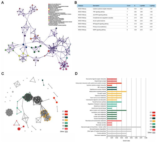 The GO network analysis and KEGG enrichment analysis on DEGs of the PTZ group and CBD group. (A) The GO network in the PTZ group. (B) The KEGG pathway analysis results in the PTZ group. (C) The network analysis on the KEGG signaling pathway by KOBAS. (D) The KEGG pathway analysis results in the CBD group.
