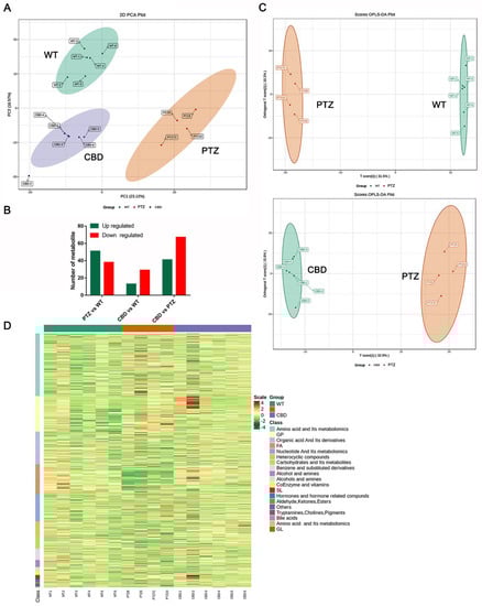 Metabolite profiling analysis of the WT, PTZ, and CBD group. (A) The PCA score scatter plot of the positive ionization mode. (B) The number of up-regulated and down-regulated metabolites between the groups. (C) The result of the Partial Least Squares-Discriminant Analysis (PLS−DA). The OPLS-DA score scatter plots were compared between the groups. (D) The clustering heat map analysis of all samples. n = 6 in the PTZ group, n = 4 in the CBD group.