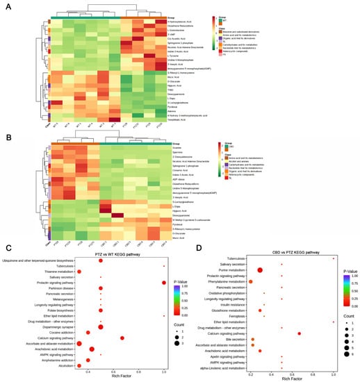 Functional analysis of pathways related to different metabolites in the PTZ and CBD group. The cluster analysis of the PTZ (A) and CBD (B) group. (C) The KEGG enrichment analysis showed the pathways of differential metabolite enrichment after PTZ kindled seizure. (D) The pathways of differential metabolite enrichment in hippocampus of PTZ kindled seizure mice treated with CBD.