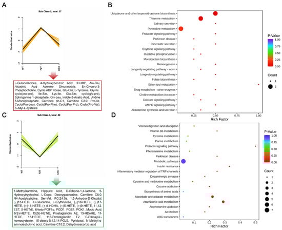 Metabolites fuzzy cluster analysis of the WT, PTZ, and CBD group. (A) The K-means clustering (K_means) analysis of 27 differential metabolites that were significantly increased in the PTZ group. (B) The KEGG pathway analysis showed the enrichment of the 27 differential metabolites. (C) The K-means clustering (K_means) analysis of 40 metabolites that were significantly up-regulated by the pre-exposure to CBD in the PTZ group. (D) The KEGG pathway analysis showed the enrichment of the 40 differential metabolites.