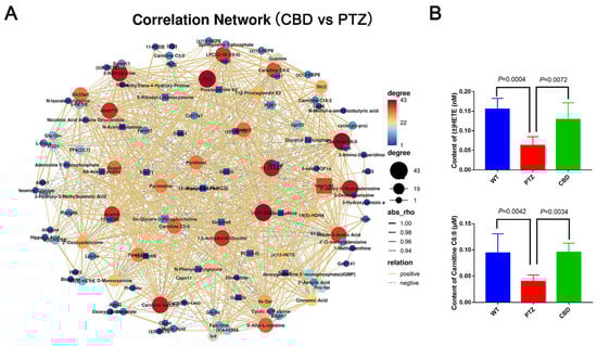 Correlation analysis of transcriptome and metabolome. (A) The correlation network between the CBD group and PTZ group. (B) The content of (+/−)15-HETE and carnitine C6:0 in hippocampus of mice in each group. n = 6, the error bar represents SD.