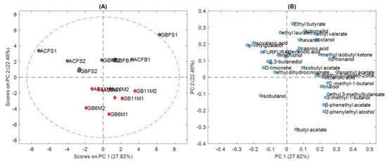 (A) Score plot of PCA analysis; (B) Loading plot of PCA analysis. ACFB—aluminium can fresh brewery; GBFB—glass bottle fresh brewery; ACFS—aluminium can fresh supermarket; GBFS—glass bottle fresh supermarket; AC6M—aluminium can 6 months aged brewery; GB6M—glass bottle 6 months aged brewery; AC11M—aluminium can 11 months aged brewery; GB11M—glass bottle 11 months aged brewery. Grey circles indicate fresh beers, red triangles aged beers and blue circles names of volatile compounds identified.