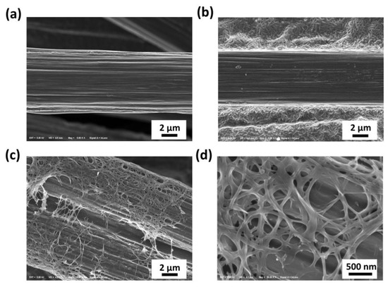 SEM images showing (a) pristine carbon paper; (b) hydrophobic commercial carbon paper; (c,d) CNF/carbon paper at 3000× and 30,000× magnification.