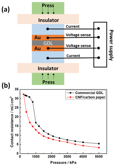 The through-plane resistances of the hydrophobic commercial carbon paper and CNF/carbon paper are shown in Figure 3. The through-plane resistance for both carbon papers decreased with the increase in pressure. The carbon papers became denser with the increase in the pressure, increasing the number of contact points of the carbon fibers inside the carbon papers. Meanwhile, the carbon papers became thinner, which shortened the distance for electron transport and caused a decrease in the through-plane resistance with increasing pressure. The contact resistance of the CNF/carbon paper was lower than that of the hydrophobic commercial carbon paper over the entire pressure range. This might have been caused by the presence of the nonconductive hydrophobic agent, which bound the carbon fiber and reduced the length of the pathway for the electron transport in the commercial carbon paper.