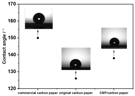 The contact angle of hydrophobic commercial carbon paper, original carbon paper, and CNF/carbon paper.