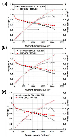Figure 5 displays the results of the single-cell test for commercial carbon paper and CNF/carbon paper. The performances of these two cells were similar when the current density was lower than 1000 mA cm−2; however, when the current density increased beyond 1000 mA cm−2, the performance of the cell assembled with CNF/carbon paper was superior to that of the cell assembled with commercial carbon paper. Figure 5a shows that the power density of the CNF/carbon paper was 1.21 W cm−2 at 100% RH, which is ~26% higher than that of the commercial GDL at 0.9 W cm−2. This is because the CNF/carbon paper had a higher porosity, which is beneficial for the diffusion and transport of the gas. A recent study by Liu and Shao et al. [10] reported the development of a novel hydrophilically modified GDL by inserting polyacrylonitrile (PAN) into the microporous layer. The cell with PAN on the GDL exhibited a maximum power density of 0.616 W cm−2, which is 30% higher than that of the conventional hydrophobic GDL (0.480 W cm−2) under low humidity. They attributed this significant enhancement in the performance to the powerful wettability and the pore structure modification of the PAN. Our study shows that the power density of the cell with CNF/carbon paper was 1.12 W cm−2 at 40% RH, which is significantly higher than that of the cell with the commercial GDL (0.7 W cm−2) and the modified GDL reported in their study. Additionally, the difference in cell voltage between the cell with the commercial GDL and CNF/carbon paper increased with decreasing relative humidity under high-current-density conditions. For example, the difference in the voltage was 0.142 V at 100% RH, 0.149 V at 70% RH, and 0.202 V at 40% RH at 2100 mA cm−2. The superior performance of the CNF/carbon paper at low RH was due to its water retention ability, which was greater than that of the commercial carbon paper, as can be observed in the contact angle results (Figure 4). At low relative humidity, the CNF/carbon paper retained more water in the GDL, which made the real relative humidity in the MEA higher than the set value and finally improved the cell performance at low relative humidity conditions. In addition, the pore structure modification of CNF made the surface of the GDL flatter, resulting in better water management of the fuel cell. The lower through-plane resistance of the CNF/carbon paper may have also contributed to its improved cell performance, which is in accordance with the results presented in Figure 3.