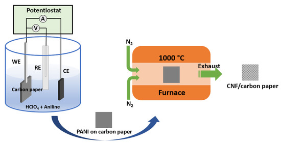 After drying in an oven at 60 °C for 4 h, the carbon paper coated with PANI nanofibers was then placed in a tube furnace under N2 (99.999% purity) with a flow rate of 150 mL min−1 for 1 h to remove any residual air. Then, the tube furnace was adjusted to increase the temperature at a ramping rate of 5 °C min−1 until the heat treatment temperature reached 1000 °C, and the temperature was then maintained for 2 h. The obtained CNF/carbon paper was coated with MPL (Wuhan WUT New Energy Co., Ltd., Wuhan, China) on one side of the carbon paper. In this way, the final CNF/carbon paper was obtained. A schematic of the preparation of CNF/carbon paper is shown in Figure 6.