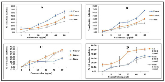 Dosedependent cytotoxicity effects of stem, leaf, and flower on A549 cell line. (A) Ethyl acetate extract. (B) Ethanolic extract. (C) Aqueous extract. (D) Ethanolic and ethylacetate extracts of roots and mix (leaves, stem, and flower).
