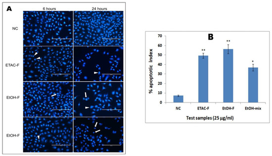 (A) These photo-micrographs illustrate the pictures of the A549 cells with Hoechst 33342 staining. The untreated cells (negative control) exhibited the cells growing in a lively manner, with clear nuclear and further cellular structures. The cells treated with the extracts showed clear characteristic apoptosis changes. The arrowheads indicate chromatin dissolution, breakdown, and fragmentation. These arrows specify the condensed, fragmented, and crescent-shaped nuclei. Among the extracts tested, EtOH-F (ethanol extract of flower) showed a more pronounced apoptotic effect on the cells. (B) Percentage representation of apoptotic indices for different tested groups. Index apoptotic for untreated (negative control) A549 cells was 7.2 ± 0.8%. In contrast, the apoptotic indices obtained for the treated cells with the ETAC-F, EtOH-F, and EtOH-mix extracts were 49.4 ± 2.7%, 56.2 ± 4.8%, and 36.9 ± 3.6%, respectively. NC = negative control; ETAC-F = ethylacetate extract of flower; EtOH-F = ethanol extract of flower; EtOH-mix = ethanol extract of the mixture. Values are presented as % mean ± SD (n = 6), * represents p < 0.05 and ** represents p < 0.01.